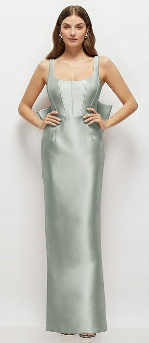 Scoop Neck Corset Satin Maxi Dress with Floor-Length Bow Tails in willow green