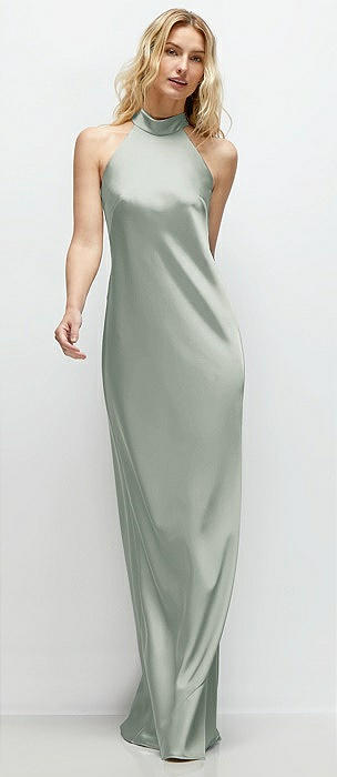 High Halter Tie-Strap Open-Back Satin Maxi Dress in willow green