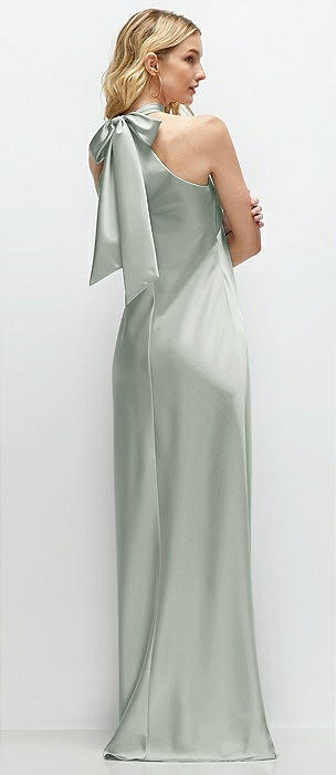 Stand Collar Bias Satin Maxi Dress with Self-Tie Bow Back in willow green
