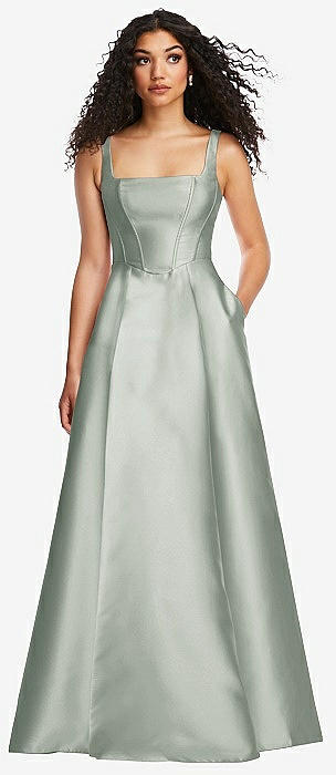 Boned Corset Closed-Back Satin Gown with Full Skirt and Pockets in willow green