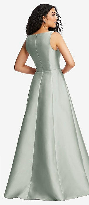Open Neckline Cutout Satin Twill A-Line Gown with Pockets in willow green