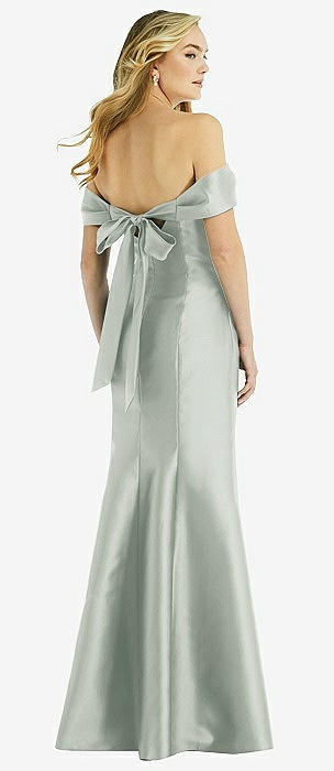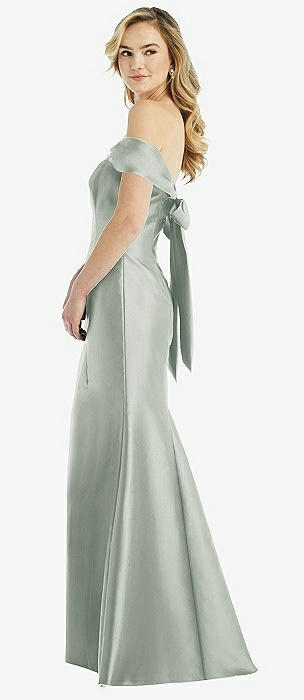 Off-the-Shoulder Bow-Back Satin Trumpet Gown in willow green