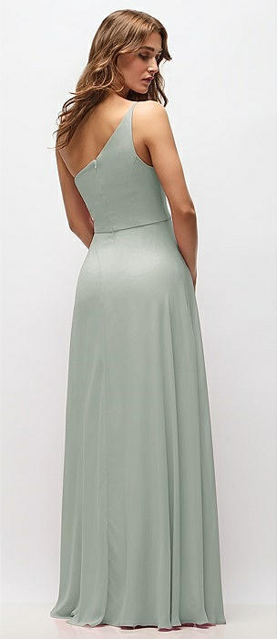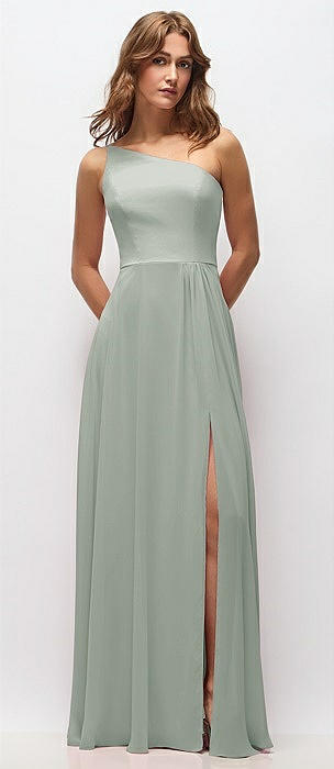 One-Shoulder Chiffon Maxi Dress with Shirred Front Slit in willow green