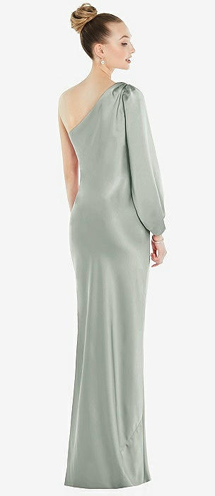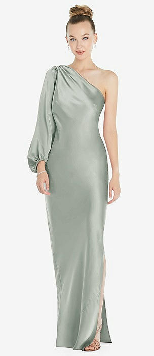 One-Shoulder Puff Sleeve Maxi Bias Dress with Side Slit in willow green