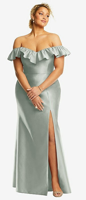 Off-the-Shoulder Ruffle Neck Satin Trumpet Gown in willow green