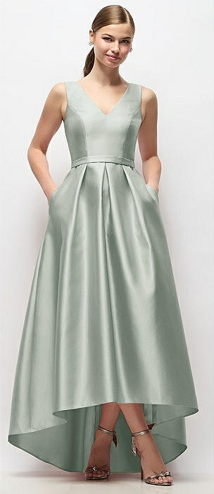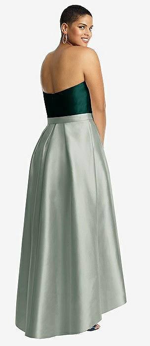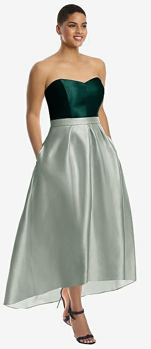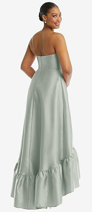 Strapless Deep Ruffle Hem Satin High Low Dress with Pockets in willow green