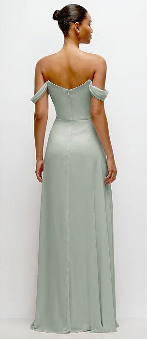 Bow-Shoulder V-Back Chiffon Gown with Front Slit in willow green