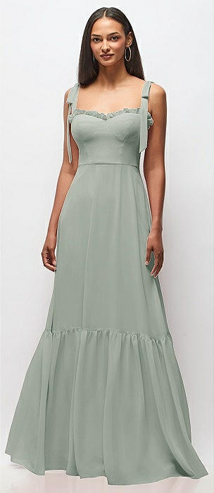 Tie-Shoulder Bustier Bodice Ruffle-Hem Maxi Dress in willow green