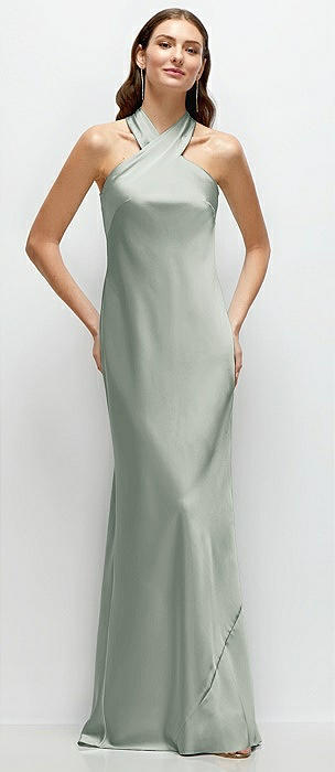 Criss Cross Halter Open-Back Stretch Satin Mermaid Dress in willow green