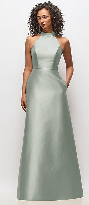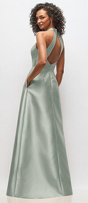 High-Neck Halter Open-Back Satin Trumpet Dress in willow green