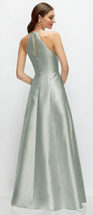 Jewel Neck Halter Full A-Line Satin Maxi Dress in willow green