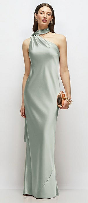 Draped Scarf One-Shoulder Bias Stretch Satin Maxi Dress in willow green