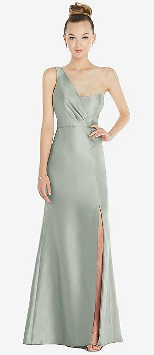 Draped One-Shoulder Satin Trumpet Gown with Front Slit in willow green