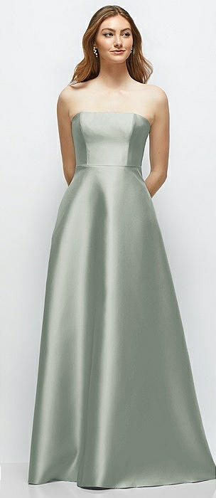 Strapless Bias Cuff Bodice Satin Gown with Pockets in willow green