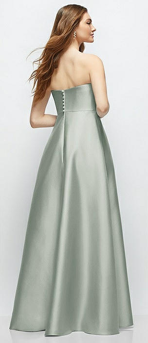 Strapless Satin Gown with Full Skirt and Covered Buttons at Back in willow green