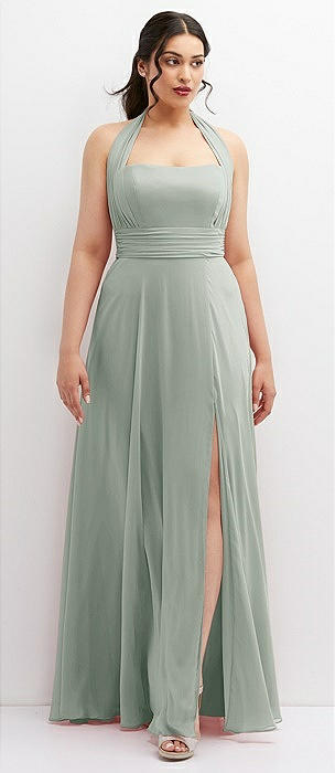 Draped Chiffon Grecian Column Gown with Convertible Straps in willow green