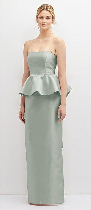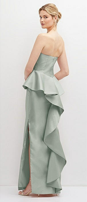 Strapless Satin Maxi Dress with Cascade Ruffle Peplum Detail in willow green