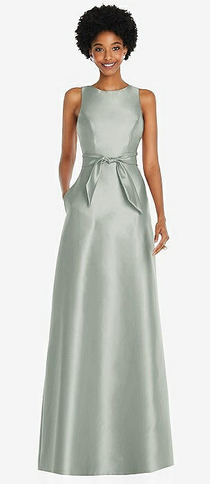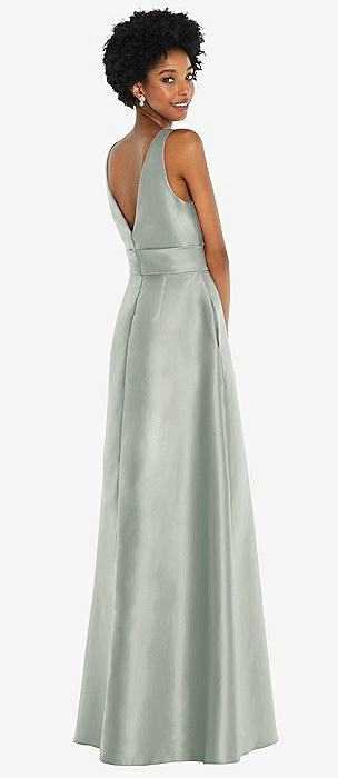 Strapless Notch Satin Gown with Pockets in willow green