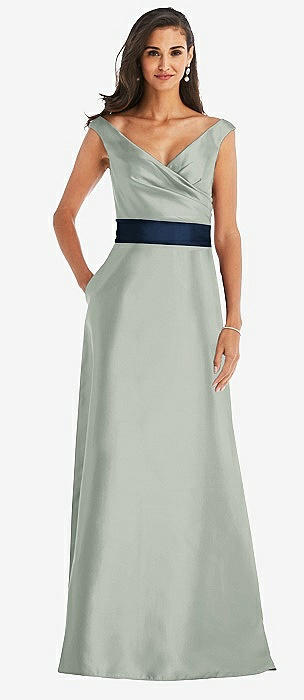 Off-the-Shoulder Draped Wrap Satin Maxi Dress in willow green