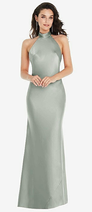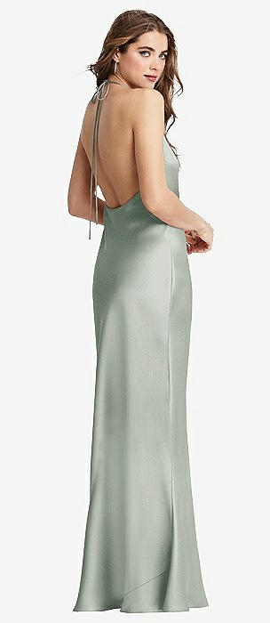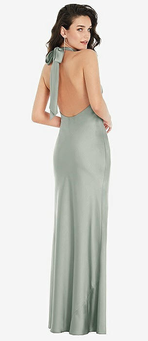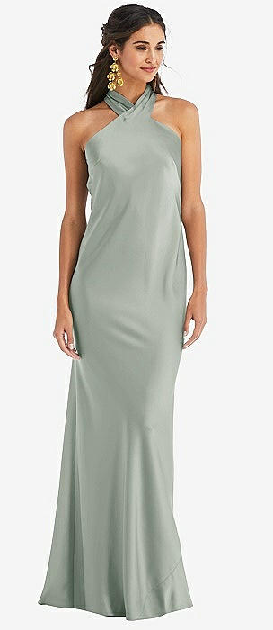 Draped Twist Halter Tie-Back Trumpet Gown in willow green