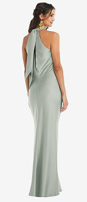 Scarf Tie High-Neck Halter Maxi Slip Dress in willow green