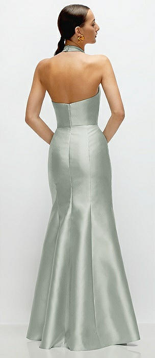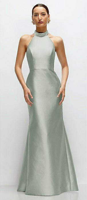 High-Neck Halter Open-Back Satin Trumpet Dress in willow green