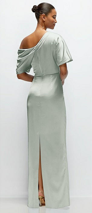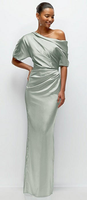 Asymmetrical Off-the-Shoulder Pleated Satin Maxi Dress in willow green