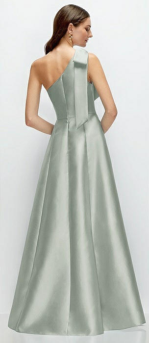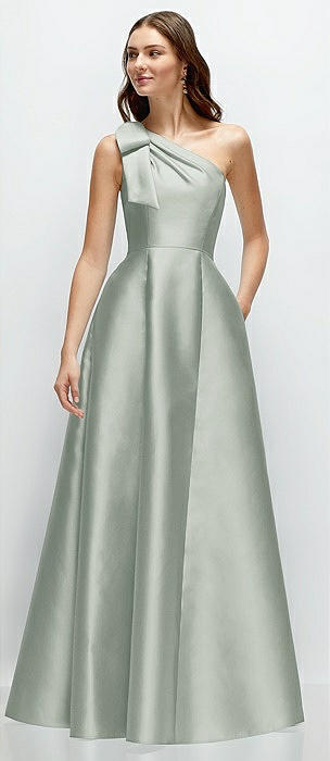Bow One-Shoulder Full A-Line Satin Maxi Dress in willow green