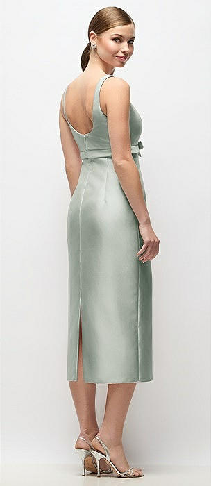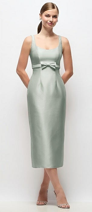 Scoop Neck Satin Column Midi Dress with Bow at Empire Waist in willow green