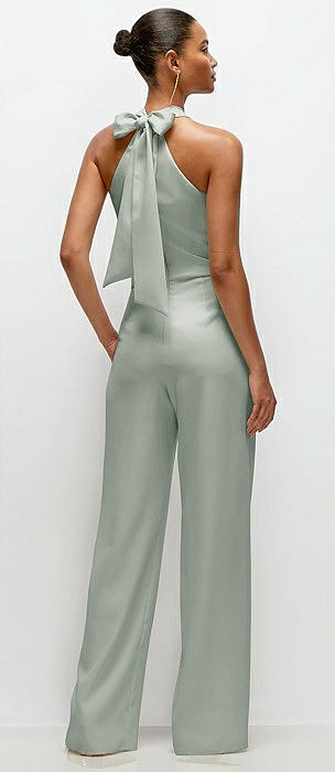 Pleated Halter Blouson Crepe Wedding Jumpsuit with Self-Tie Bow Back in willow green