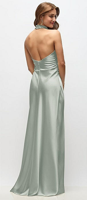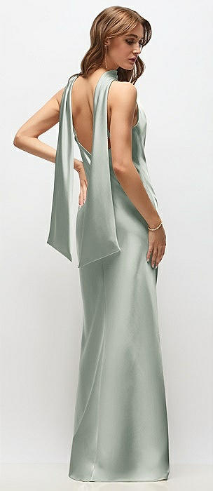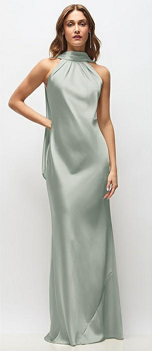 Draped Scarf Halter Open-Back Stretch Satin Bias Maxi Dress with Adjustable Straps in willow green