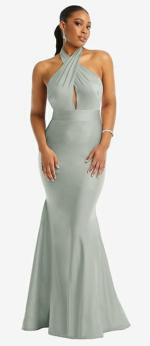 Criss Cross Halter Open-Back Stretch Satin Mermaid Dress in willow green