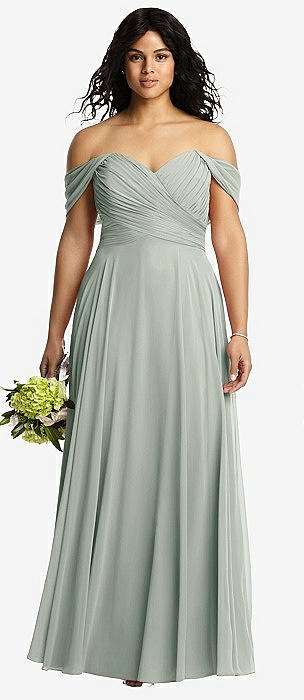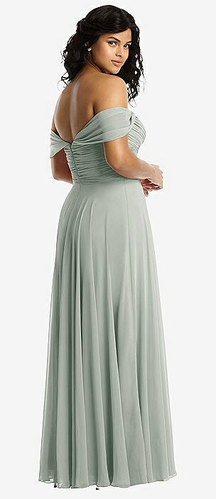 Off-the-Shoulder Criss Cross Back Trumpet Gown in willow green