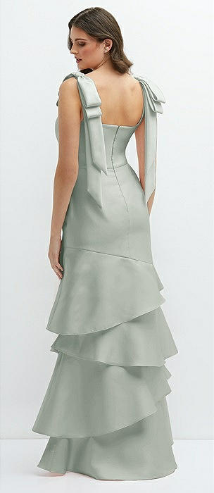 Bow-Shoulder Satin Maxi Dress with Asymmetrical Tiered Skirt in willow green