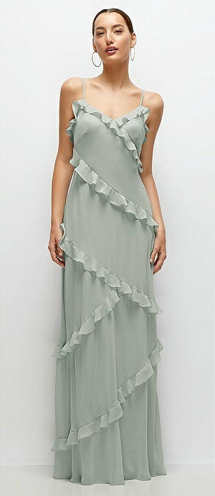 Asymmetrical Ruffle Chiffon Bias Slip Maxi Dress in willow green