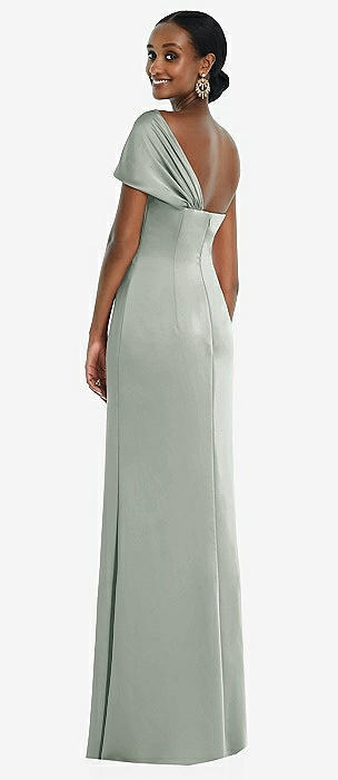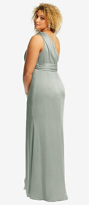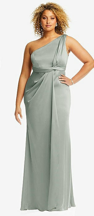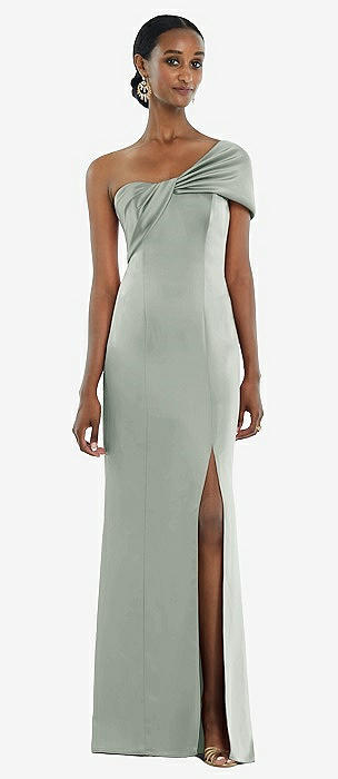 One-Shoulder Draped Twist Empire Waist Trumpet Gown in willow green