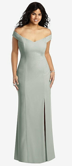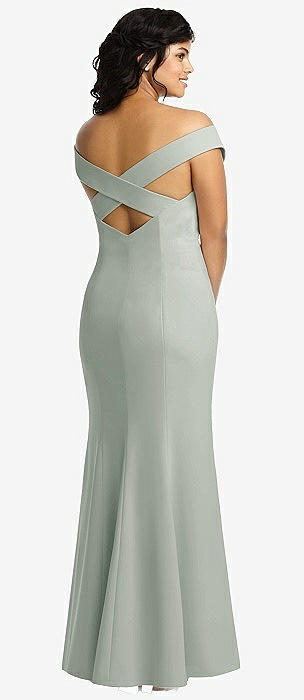 Off-the-Shoulder Criss Cross Back Trumpet Gown in willow green