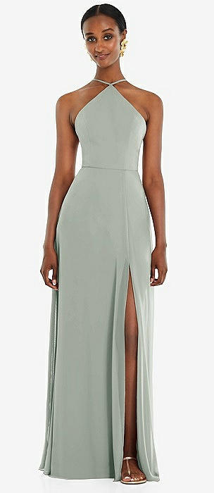 High Halter Tie-Strap Open-Back Satin Maxi Dress in willow green
