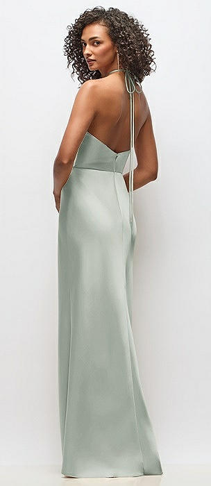 High-Neck Halter Stretch Satin Maxi Dress with Bias A-line Skirt in willow green