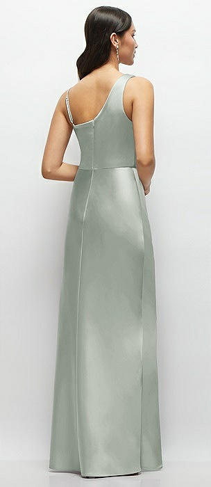 One-Shoulder Draped Cowl A-Line Satin Maxi Dress in willow green