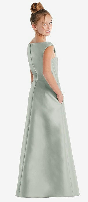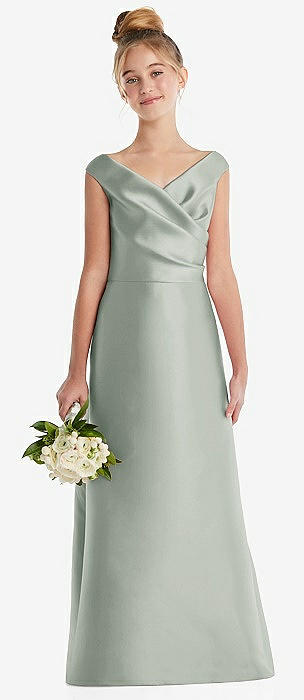 Off-the-Shoulder Draped Wrap Satin Junior Bridesmaid Dress in willow green